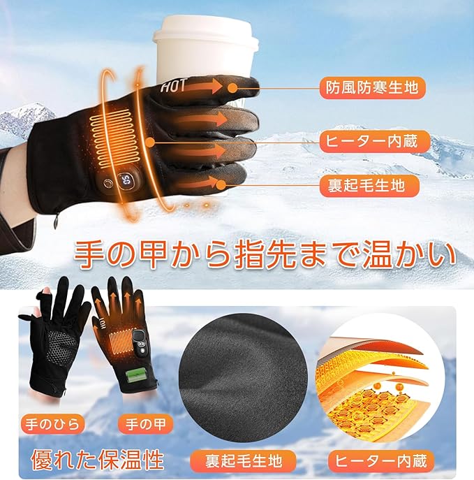 ヒーター内蔵 防寒グローブ 【USB充電 3段温度調整 デジタル画面付き】 電熱手袋 滑り止め スマホ対応 スポーツグローブ サイクリング 釣り カメラ 通勤通学用 アウトドア 冬用