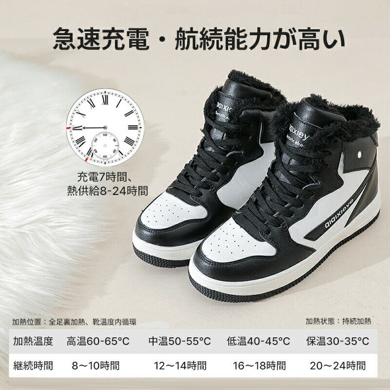 【P5+全商品最大2000円offクーポン配布】電熱スニーカー 電熱シューズ 電熱ブーツ 男女兼用 電熱靴 アダプター 4段調温 バッテリー内蔵 ヒーター靴 仕事 自宅 通学 通勤 レザー靴 合成革 暖かい 防寒 保温 電熱靴下 電気足温器 靴 足冷え対